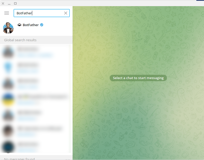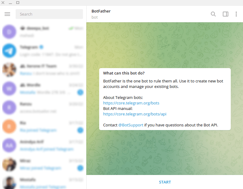 To build a Telegram bot with Prime by Xifu Halim, first, open your Telegram App. Then in the search bar of the app, search with the ‘BotFather’ keyword. Then select the verified BotFather account.