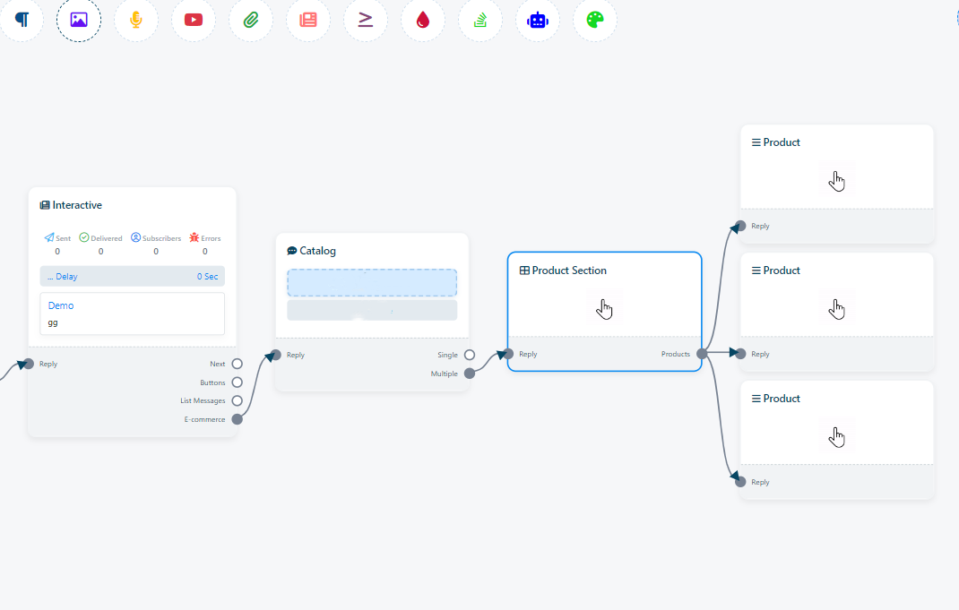 - Add `Interactive` and Right-click on E-commerce socket and drag your mouse into the flow builder. This action will make the `Catalog` element appear.