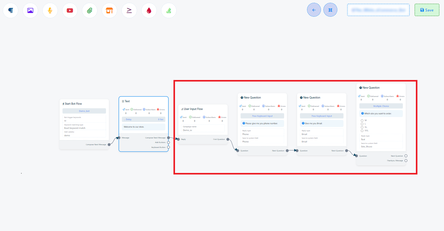 You may easily include your User Input Flow campaign into the flow of your other bot after it is set up. When a user encounters the User Input Flow component in your bot`s flow, they will be prompted with the questions defined in your campaign. Their responses will be automatically recorded in the specified custom fields.